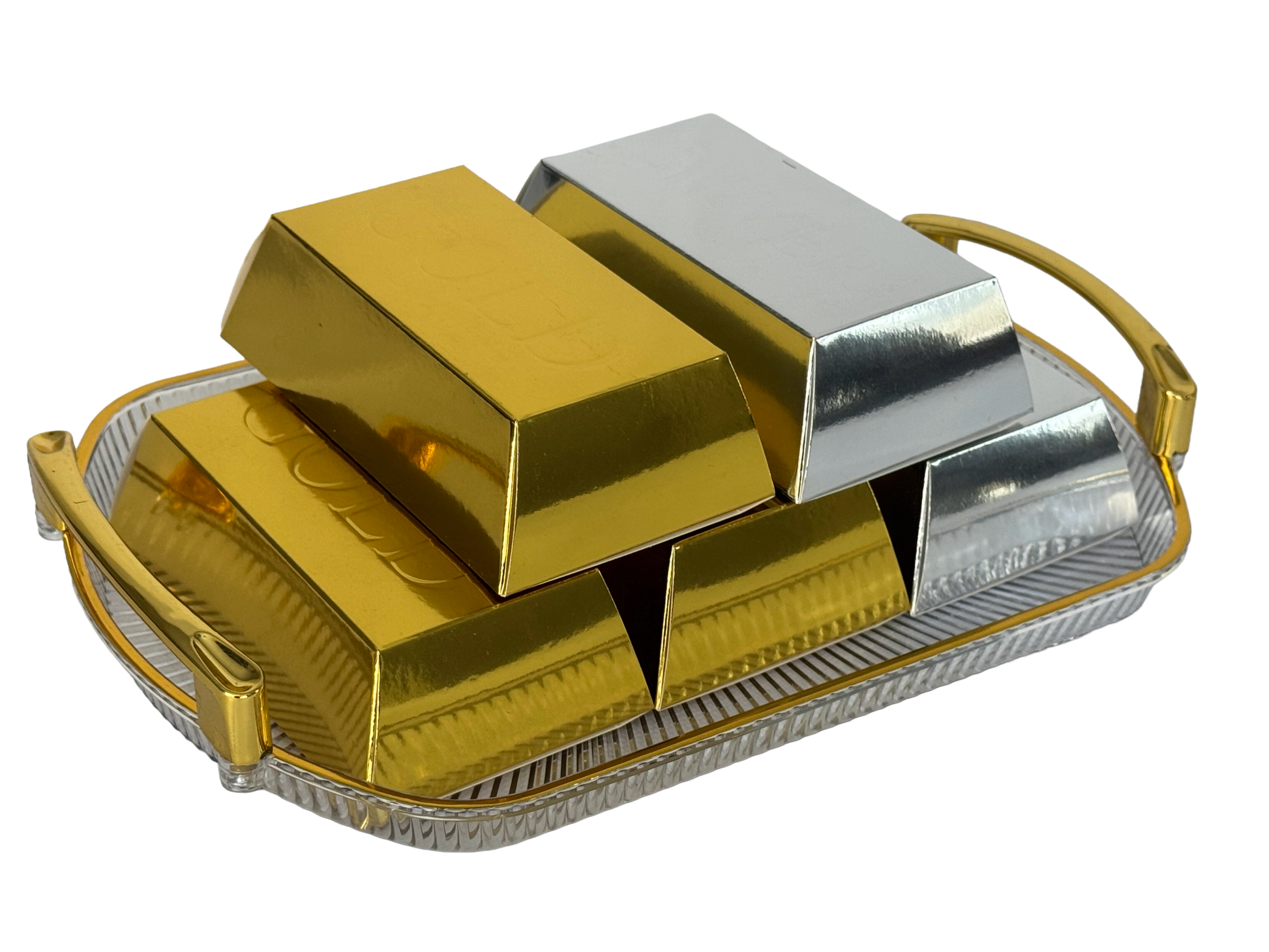 These boxes are styled as an ignot bar. The gold has GOLD embossed writing on top, the silver has SILVER writing embossed on top. These boxes are made from good quality card and have a glossy metallic shiny finish.